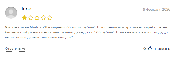 В отзывах о Meituan01 люди рассказывают, как потеряли десятки и даже сотни тысяч рублей. Им позволили вывести только крошечные суммы по сравнению с вложениями, а кто-то вообще ничего не получил.
