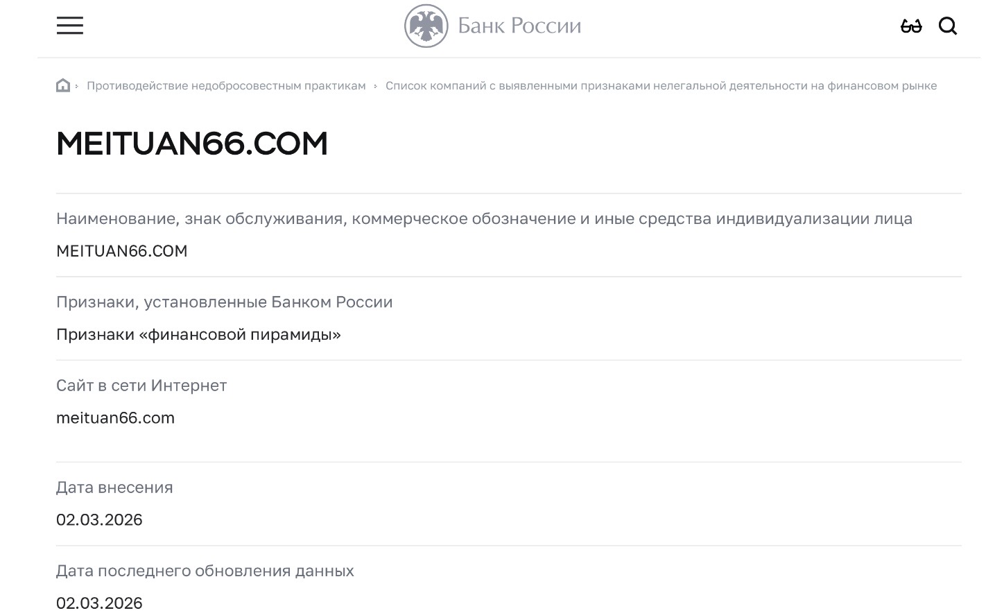Если говорит о юридической стороне работы «Мейтуан 66», то тут все очень плачевно. Во-первых, сама компания нигде не зарегистрирована, то есть официально ее не существует. Во-вторых, Центробанк считает ее мошеннической и прямо указывает, что в деятельности проекта обнаружены признаки финансовой пирамиды.