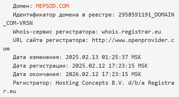 Домен Mepsod com был зарегистрирован в середине февраля 2025 года.