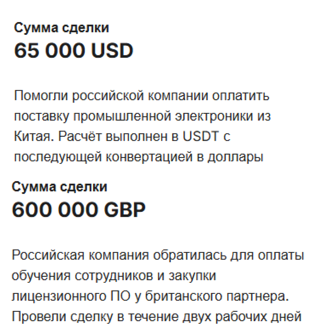 Первый кейс — оплата поставки промышленной электроники на 6 миллионов рублей. Если это не санкционные товары, то их можно свободно закупить в России. И даже не сильно потерять в цене. Чипы таким образом не поставишь, да и никто не стал бы писать это в публичном кейсе.