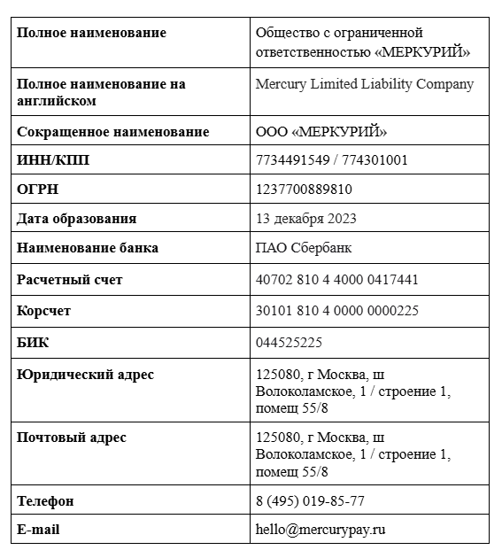 Почта для официальной связи — hello mercurypay ru. Для решения нестандартных вопросов можно обратиться в mercurypay_hello_bot или по номеру в WhatsApp или Telegram.