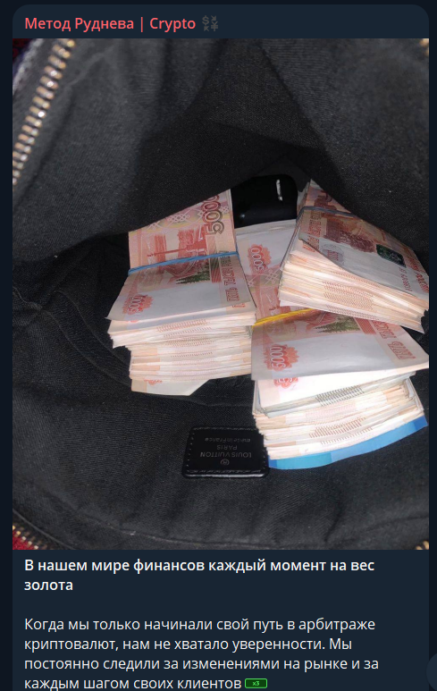 Сообщество Метод Руднева Crypto создали в 2023 году. Его владелец пообещал подписчикам актуальную информацию по крипте, помощь в освоении арбитража и актуальные связки. Информации о его опыте и прошлых успехах нет.