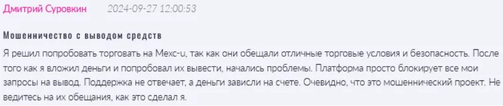 В интернете мало отзывов о MEXC-U: биржу толком не смогли раскрутить, большого количества жертв быть не могло. В оставшихся отзывах жертвы мошенников сообщают о том, что деньги отбирают, а вернуть ничего не получается.