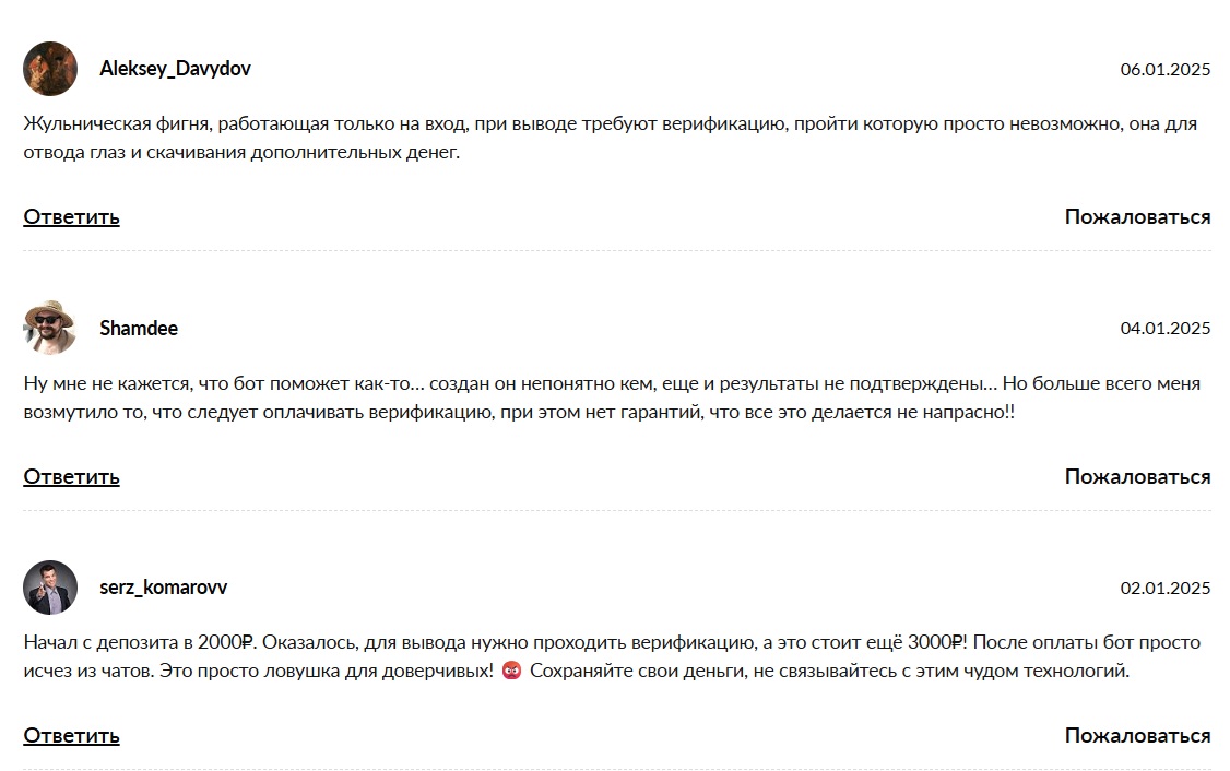 Положительных отзывов от реальных людей, которые смогли вывести прибыль и остались довольны работой бота, обнаружить не удалось. Все, что можно найти в сети — это либо предупреждения от обманутых пользователей, либо откровенно фейковые комментарии, оставленные накрутчиками. Такое полное отсутствие позитивного фидбэка при наличии негативных историй говорит само за себя.