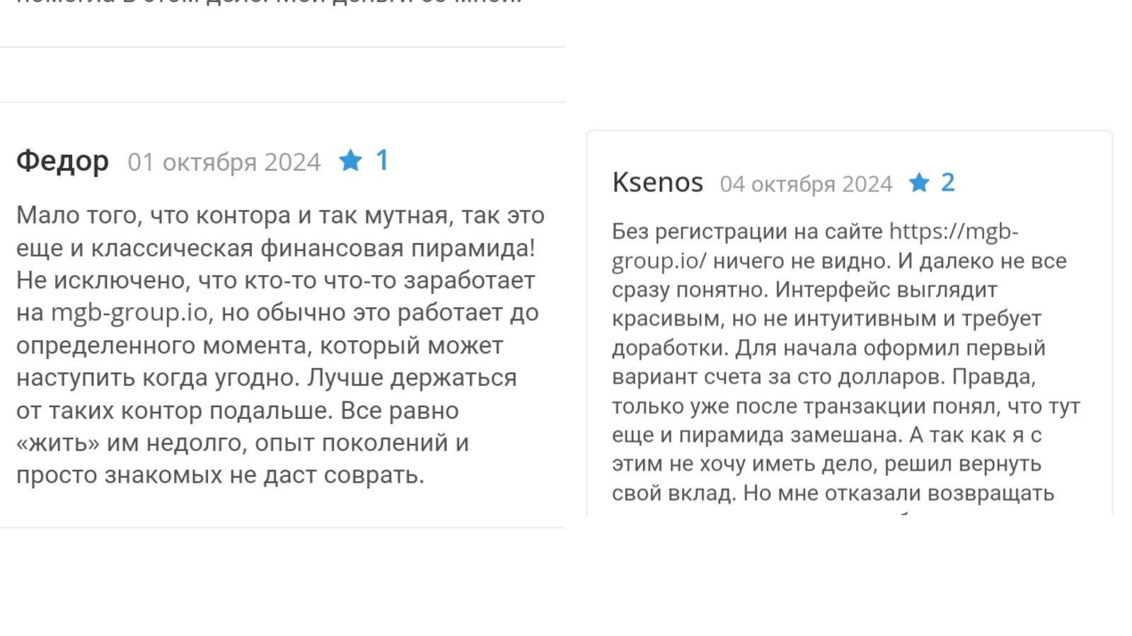 На платформе нет категории с высказываниями инвесторов. В Телеграмме компании комментирование закрыто. Есть подозрения, что авторы закрыли доступ, чтобы избежать жалоб в свой адрес. На тематических площадках мы нашли отрицательные отзывы о Mgb Group.