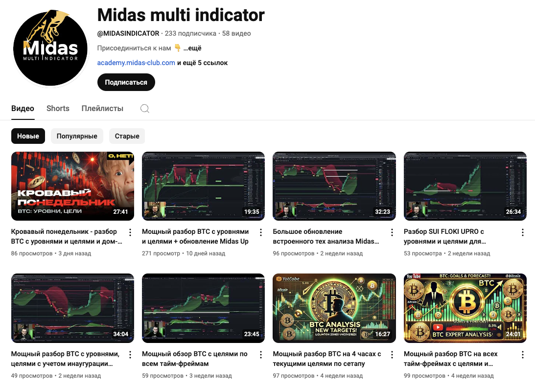 На YouTube-канал Midas multi indicator, MidasIndicator подписано 233 пользователя. Ролики выходят примерно 1-3 раза в неделю. Видео просматривают в среднем по 50-200 раз.