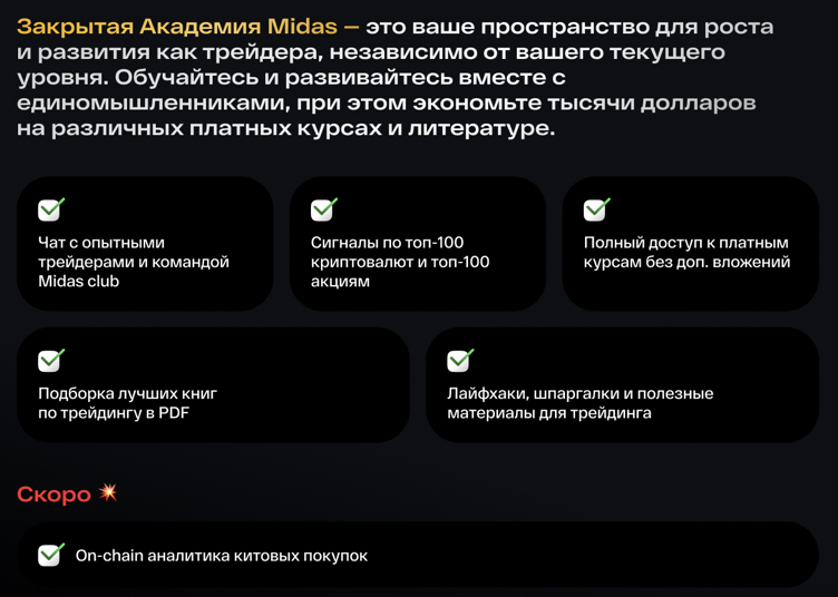 В рамках проекта организована обширная база знаний, которая находится по адресу academy midas club com. Также при возникновении вопросов потенциальный клиент или уже купивший подписку участник может обратиться в техподдержку — Midas Support в Telegram.