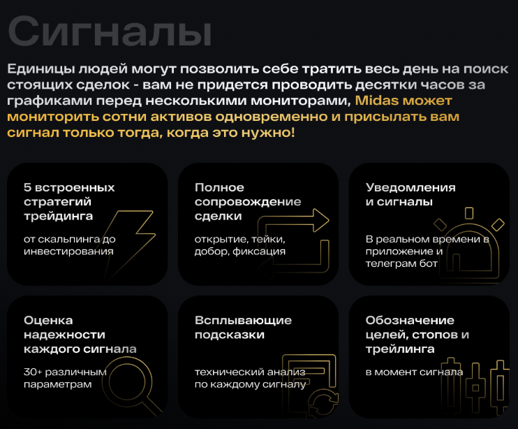 Главная услуга, которую оказывают в рамках проекта Midas Ind — это сигналы. Его основатели обещают предоставлять информацию о «стоящих сделках», которая включает в себя: оценку надежности, торговые стратегии, полное сопровождение, уведомления, подсказки и пр.