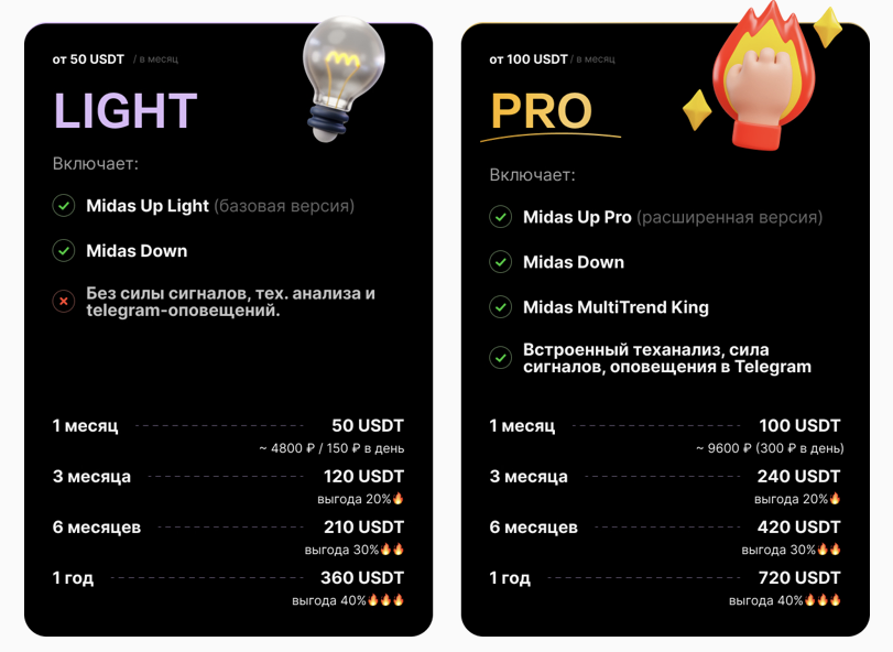 Оформить подписку на услуги можно через телеграмм-бота Midas multi indicator bot. Есть два тарифа: Light и Pro. Стоимость первого составляет от 50 USDT в месяц, а второго — от 100 долларов. Также есть трехдневный бесплатный тест-драйв.