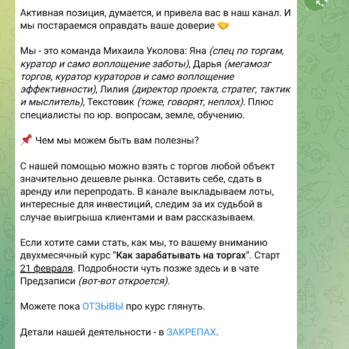 В теме торгов по лотам банкротов Уколов делает акцент на низкой конкуренции и высокой доходности. Он регулярно подчеркивает, что торги — это не кнопка бабло, а процесс, требующий анализа и дисциплины. Автор пытается развивать свой проект в трех направлениях: