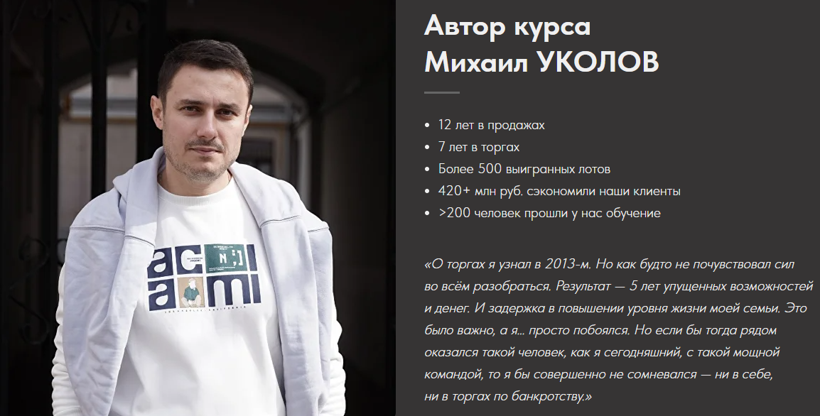 В своей презентации Михаил Уколов представляется как специалист с опытом “7 лет в торгах” и “12 лет в продажах”. Он делает акцент на личной истории роста — от отсутствия капитала и долгов до собственной команды, автомобиля и собственной недвижимости. С его слов, финансовый успех к нему пришел тогда, когда он начал торговать недвижимостью с аукционов по банкротству. Сначала он подбирал объекты для себя, потом для друзей, для их друзей, пока это занятие не переросло в полноценный бизнес.