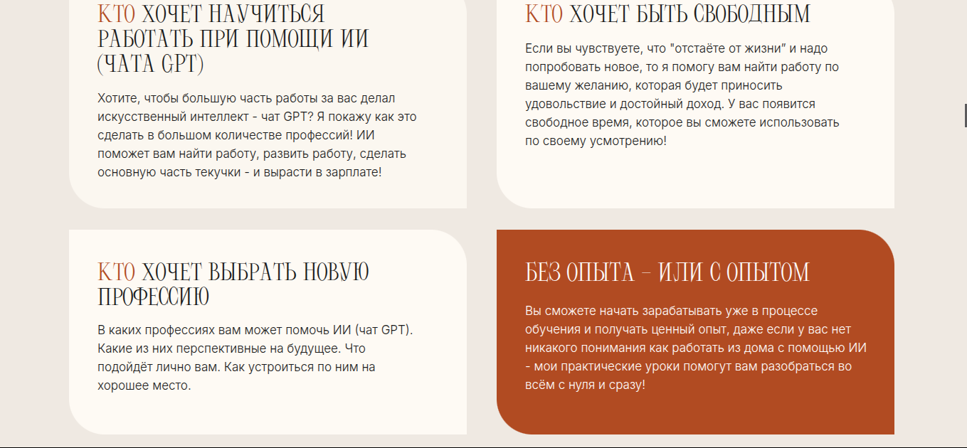 - Охват всех профессий, где можно использовать ИИ: копирайтинг, дизайн, онлайн-торговля, консалтинг и аналитика.
