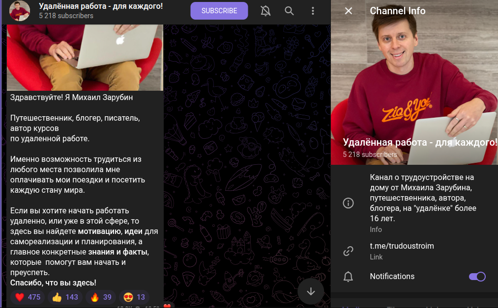 Михаил Зарубин — профессиональный аналитик, опытный инвестор, путешественник, который рассказывает, как можно в удаленном режиме зарабатывать плюс к прибыли. Кроме того, автор телеграм-канал по вакансиям Trudoustroim сообщает, что в рамках проекта каждый пользователь получит поддержку и гарантированное трудоустройство. Также лектор сообщает про вакансии с миллионными заработками. Статистику собственных сделок и работы подписчиков Михаил не демонстрирует.