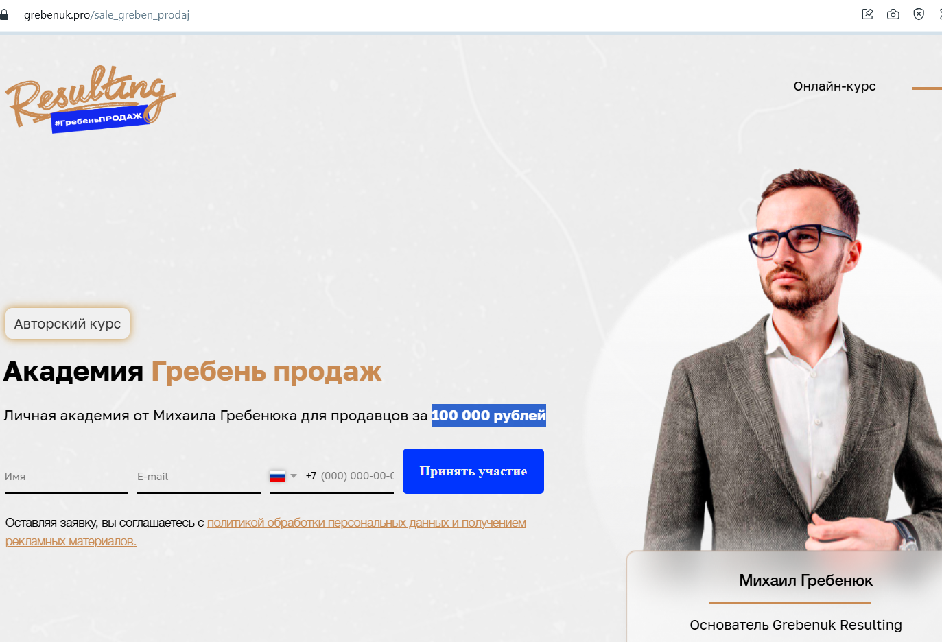 Основной продукт предпринимателя – курс продаж от Михаила Гребенюка «Гребень», где он разбирает как увеличивать прибыль. Цена курса ₽100,000 и он включает в себя 40 часов контента, 97 видеоуроков и практику.