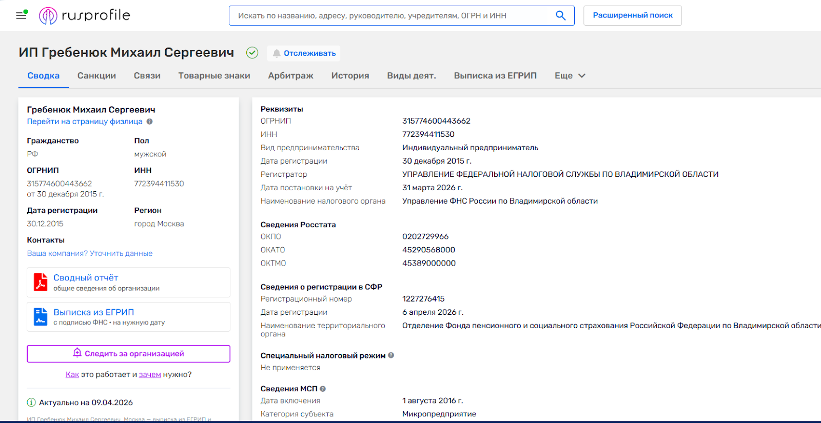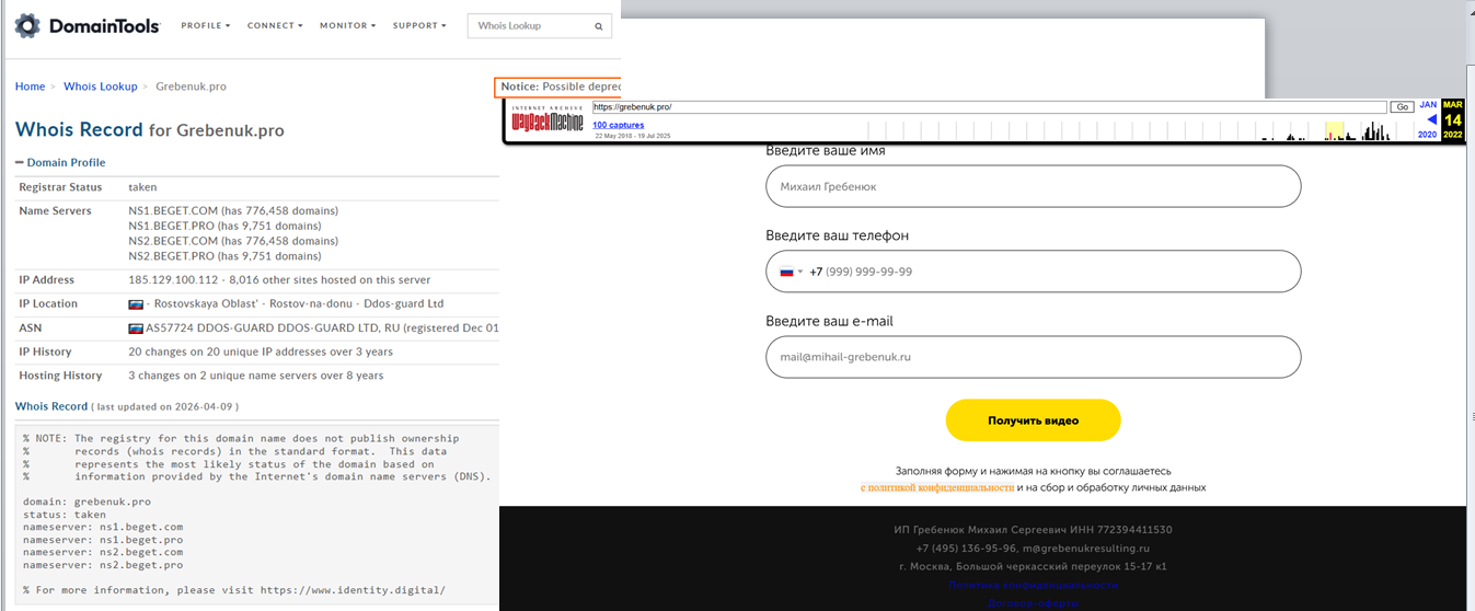 У Михаила Г. несколько порталов и соцсетей для продвижения проекта. В карточке данных Whois нет данных, когда зарегистрировали домен основного сайта Grebenuk pro, но архивы WaybackMachine уточняют, что его запустили в 2022 году.