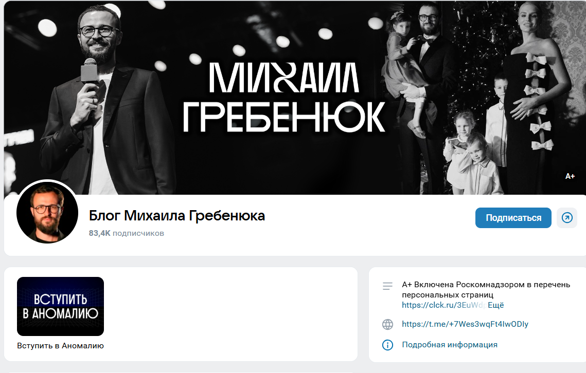 В сообществе вот «ВКонтакте» у автора есть «Блог Михаила Гребенюка», в котором на апрель 2026 года 83 400 подписчиков. Контент похож с телеграмм-каналом и посты часто дублируются.