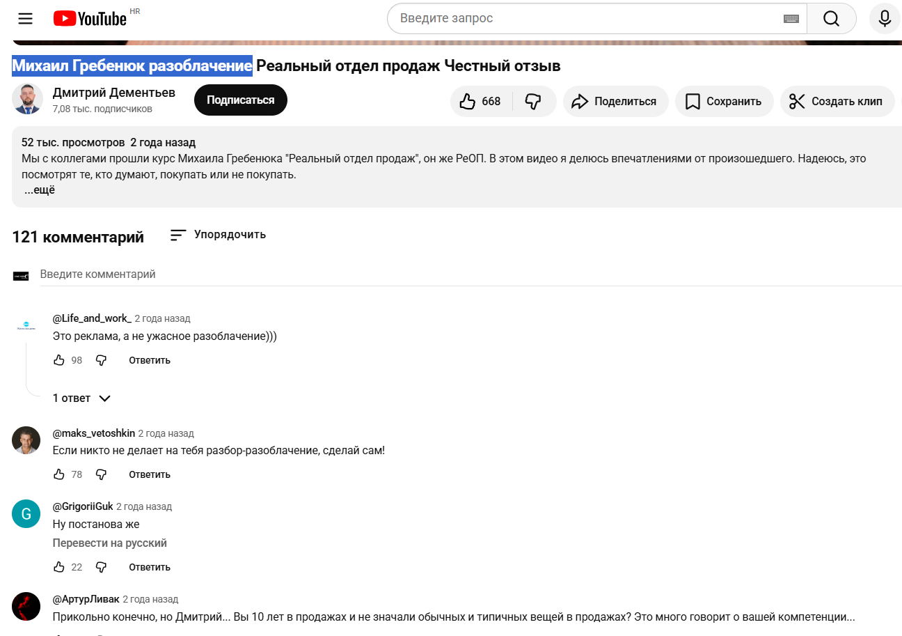 В сети есть видеоролики, где в заголовках написано «Михаил Гребенюк – аферист и его разоблачение». Эти видео снимает сама команда автора и в них якобы развенчивает миф о том, что Михаил Г. – это мошенник и обманщик. В отзывах люди жалуются, что видео постановочные и многое говорят об авторе, как профессионале и преподавателе. Зрители чувствуют себя обманутыми и оставляют негативные комментарии.