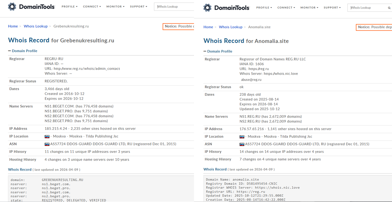 Кроме этого сайта, у автора есть лендинг GrebenukResulting ru, зарегистрированный в 2016 году и Anomalia site, домен которого появился в августе 2025 года.