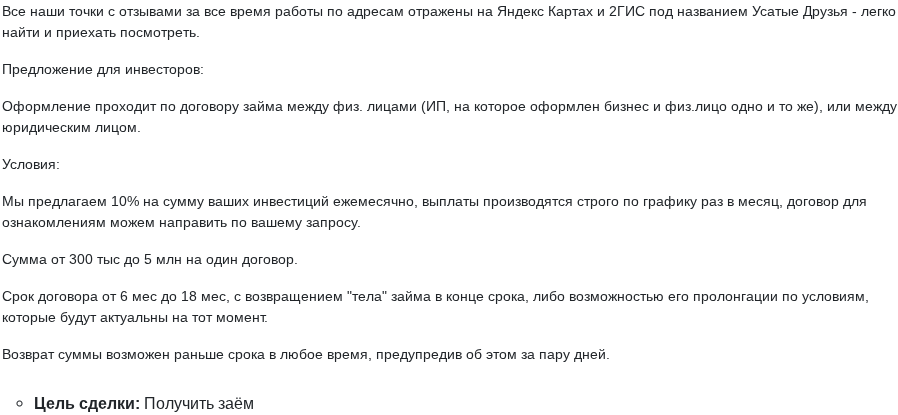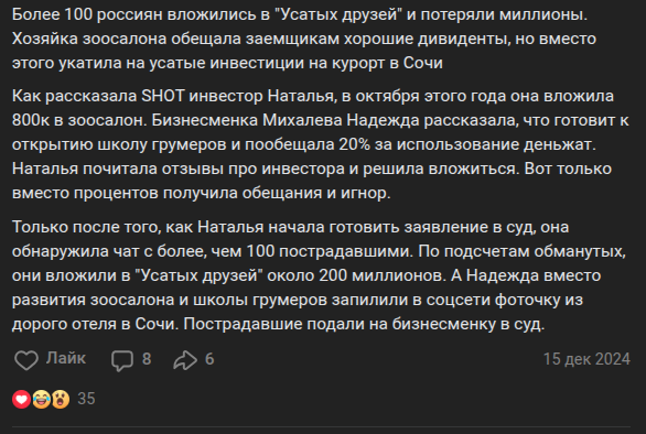 Создатель инвестиционного юридического лица и сети ветеринарных заведений ранее заявлял, что каждый вкладчик получает повышенный процент по вкладам — до 20%, даже за минимальные инвестиции, например, в 500 рублей. В ходе исследования мы увидели, что после подачи заявления в суд на Михалеву Надежду Алексеевну за мошенничество и пирамиду по инвестициям от ИП зоосалон «Усатые Друзья» была чистка присутствия проекта.