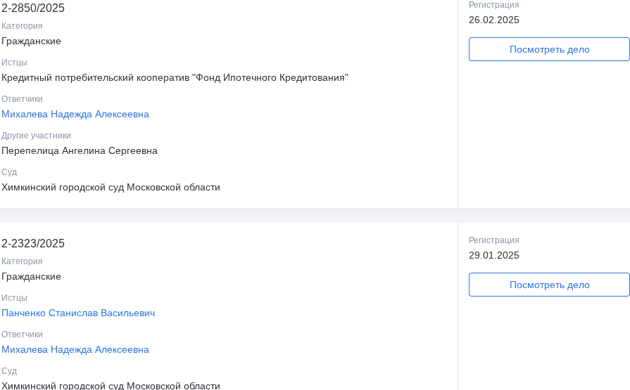 - Гражданский — 2-2323/2025. Истец — Кредитный потребительский кооператив «Фонд Ипотечного Кредитования». Зарегистрирован в реестре — 26.02.2025 года.