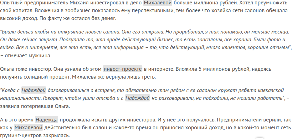 Почему Михалеву Надежду Алексеевну считают мошенницей, детали суда и расследования «Рен Тв» по делу обмана инвесторов пирамидой зоосалоном ИП «Усатые Друзья» — расскажем в отзыве по займам в Москве ООО «ВетДруг».