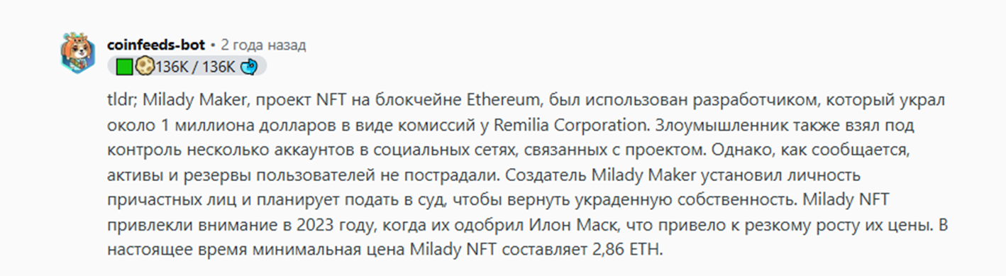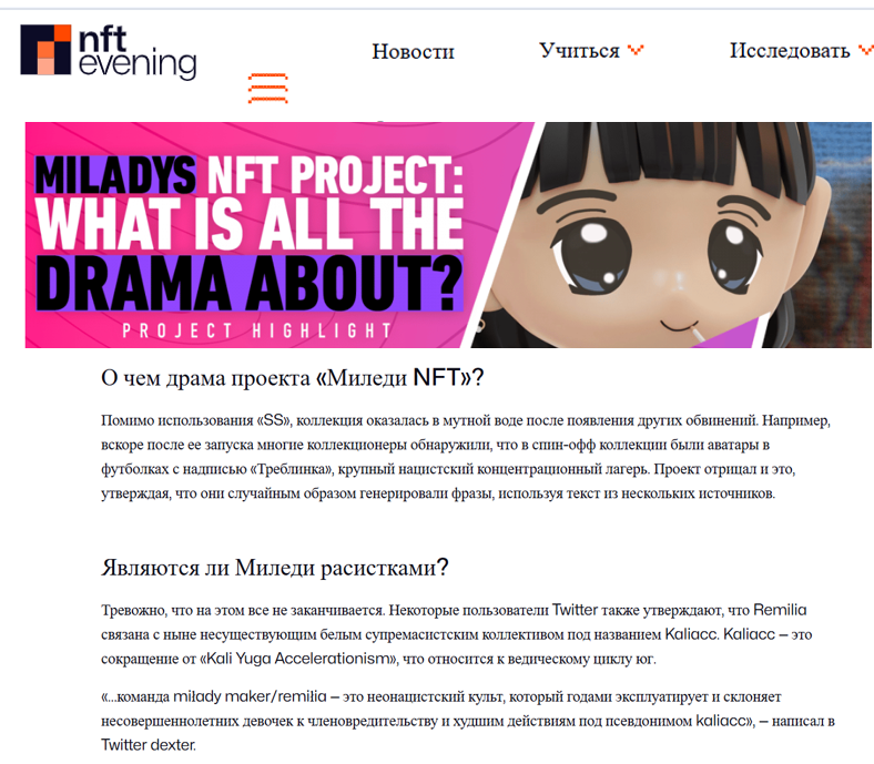 Контроверсий не занимать: идеология и токсичный фон. NFT Evening, Bubblegum Club и NFTevening раскопали старые высказывания Charlotte Fang (Miya), включая обвинения в расизме, гомофобии и экстремизме. В результате репутации проекта был нанесен серьезный удар и поливалюта Milady упала на 60 %.
