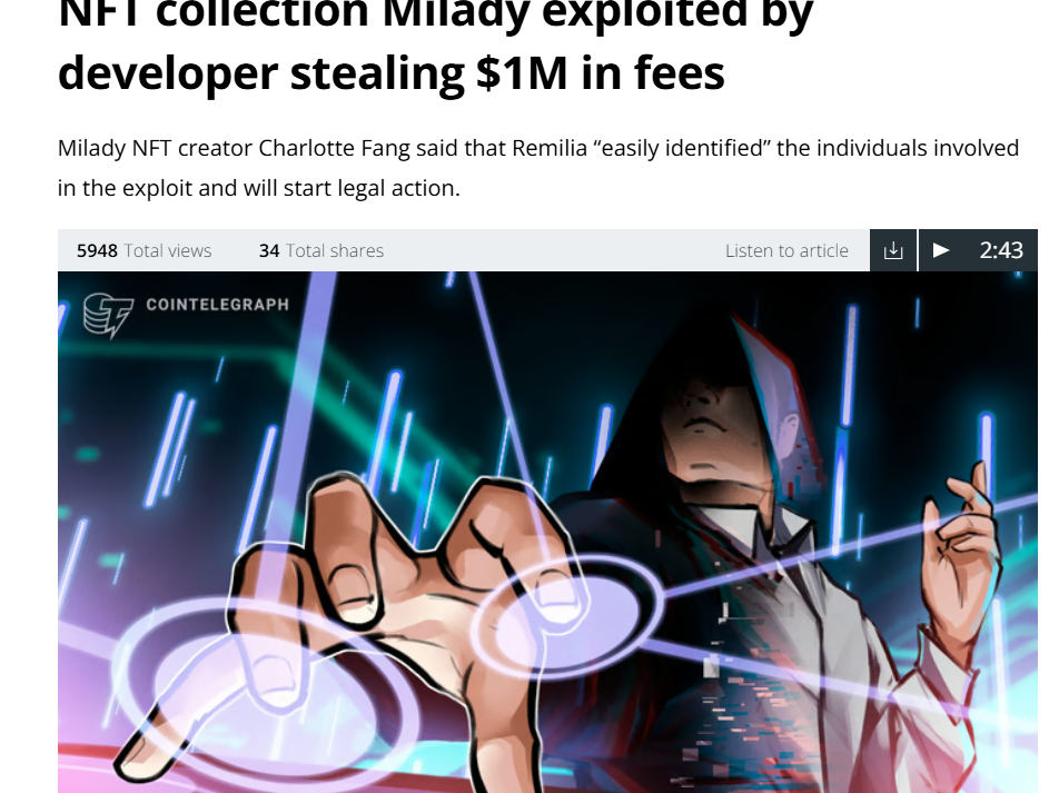 Эксплойт $1 млн. украдено изнутри: Cointelegraph и BitDegree сообщили, что в сентябре 2023 г. внутренняя ошибка позволила одному из разработчиков вывести около $1 млн комиссий из DAO Remilia, связанного с Milady Maker.