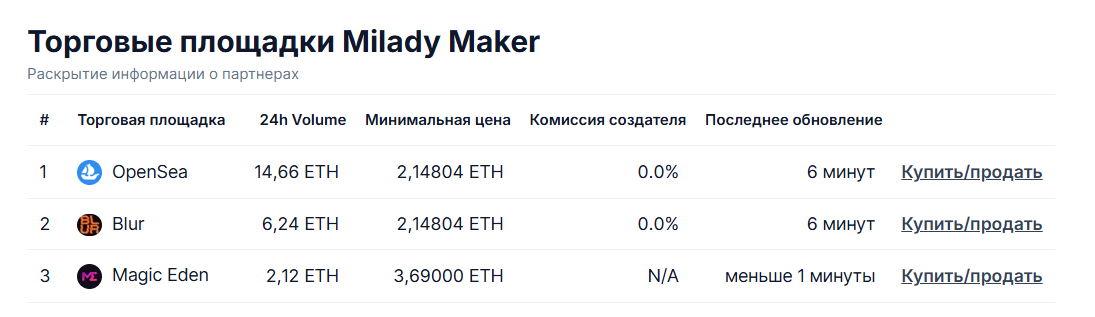 Milady торгуется на Ethereum, в первую очередь, через OpenSea и Blur. По состоянию на 2025 г., floor price колеблется в районе 2–3 ETH, а редкие экземпляры улетают за десятки ETH.