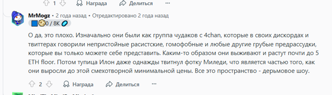 • Юридические драмы: в 2023-2024 гг. команда Remilia Collective конфликтовала внутри, обвиняя друг друга в финансовых махинациях и краже активов.