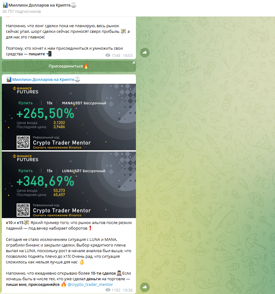 - Продажа сигналов. На некоторых каналах мошенник задействует иные варианты развода пользователей — путем продажи торговых рекомендаций и VIP-каналов с доступом к такой информации. После получения оплаты Crypto Trader Mentor передает пользователям заведомо убыточные сигналы. В результате клиенты теряют деньги, а мошенники, наоборот, зарабатывают.