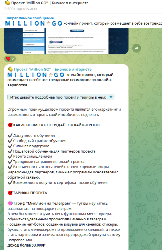 «Проект Million Go Бизнес в интернете» – бесплатная платформа для продажи сомнительных курсов. Лента канала даром знакомит посетителей с обещаниями огромных заработков и рекламой курсов. Сами же курсы реализовываются на сайте millionontelegram ru. Здесь можно купить программы: