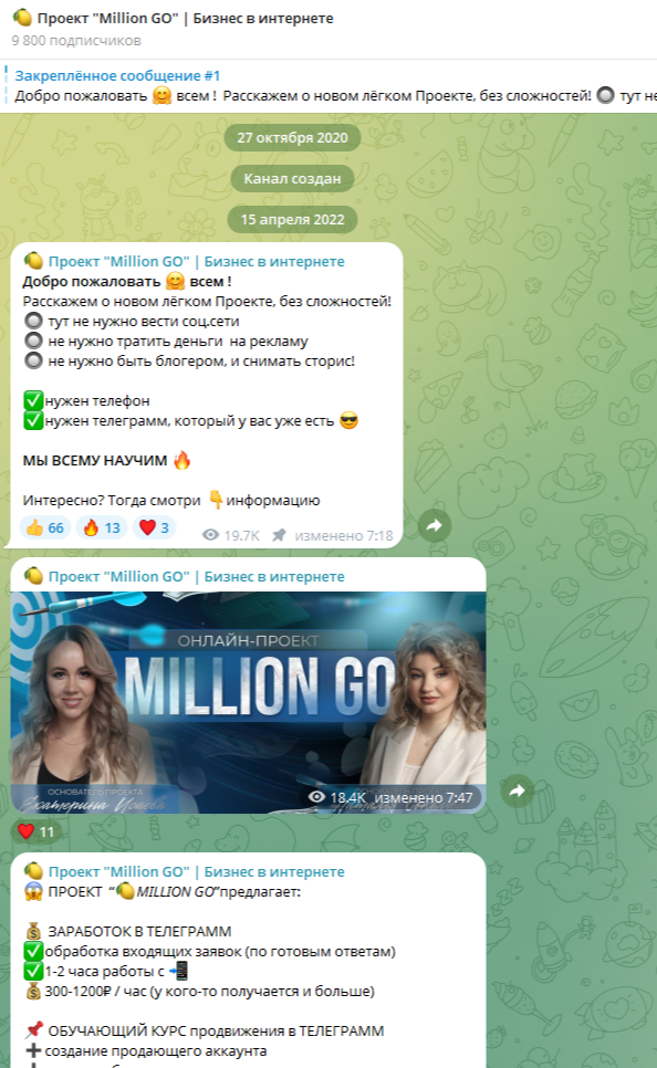 Ресурс по реализации сомнительных курсов «Проект МиллионГо Бизнес в интернете» появился в мессенджере 27 октября 2020 года. Первая публикация на канале датирована 15 апреля 2022 года. Именно тогда стартовали продажи бесперспективных курсов. На момент обзора ресурс имеет практически 10 000 подписчиков. Посты канала обычно интересны около 3 000 пользователей. Резкие всплески интереса до 16 000 говорят о накрутке ботами.