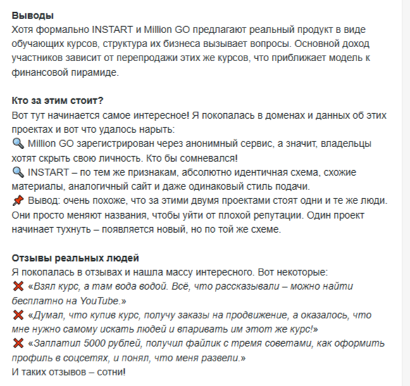 Продажами бесполезных курсов финансовая пирамида занимается на протяжении практически четырех лет. За это время интернет не увидел ни одного позитивного отзыва о канале «Проект Million Go Бизнес в интернете». Никто из бывших учеников не пожелал написать о реализованных на деле возможностях и прибыльных новых онлайн-проектах.