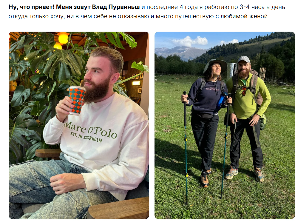 Настораживает и то, что мы почти ничего не знаем про Влада. Он не дает ссылок на свои соцсети, не считая телеграм-аккаунта Vlad Techspec, и не рассказывает свою биографию. Пурвиньш сообщает лишь, что последние 4 года работает по 3–4 часа в день и много путешествует с женой. Даже здесь мы видим «скрытую рекламу» через демонстрацию красивой жизни.