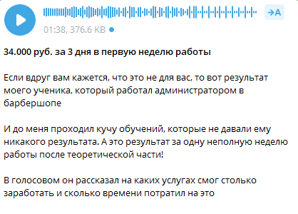 В одном из постов автор блога рассказывает, что зарабатывает около 100 тыс. руб. в неделю, выполняя функции «технического специалиста». Например, он оформляет тренинги, собирает чат-ботов и делает другую похожую работу.
