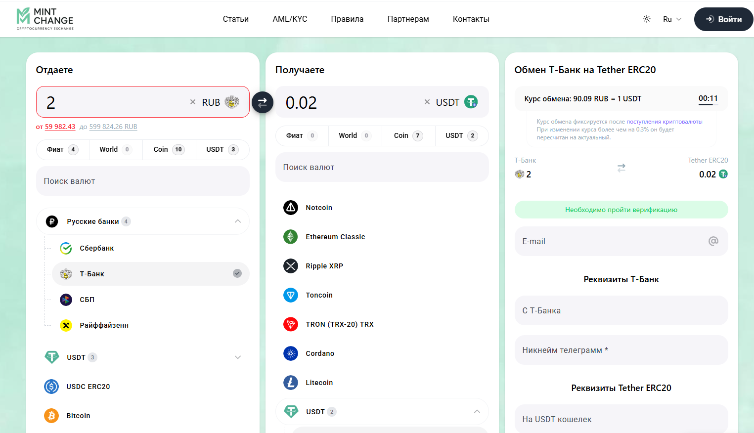 Процесс обмена стандартный. Вы заполняете заявку. Иногда просят пройти верификацию. Но есть подводный камень. Обменник Mint change не фиксирует курс сразу. Он может измениться, пока ваши деньги идут до сервиса. Вы можете отправить крипту на 100 000 рублей, а из-за падения курса получаете 99 500. Сервис честно предупреждает, что при изменении курса больше чем на 0.3% его просто пересчитают.