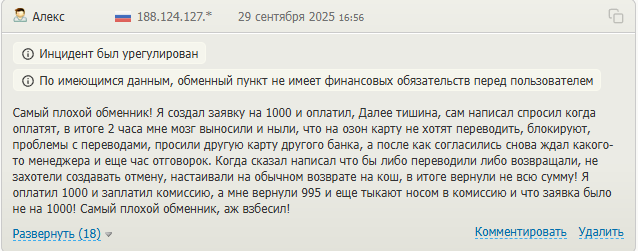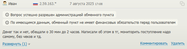 В них люди рассказывают похожие истории. Деньги идут очень долго. Иногда больше суток. Один клиент жаловался, что из отправленных 2000 USDT ему сначала пришла только четверть суммы. Другой столкнулся с проблемой при возврате. Сервис не смог сделать перевод и предложил отмену, но в итоге вернул 995 рублей вместо 1000, сославшись на комиссии.