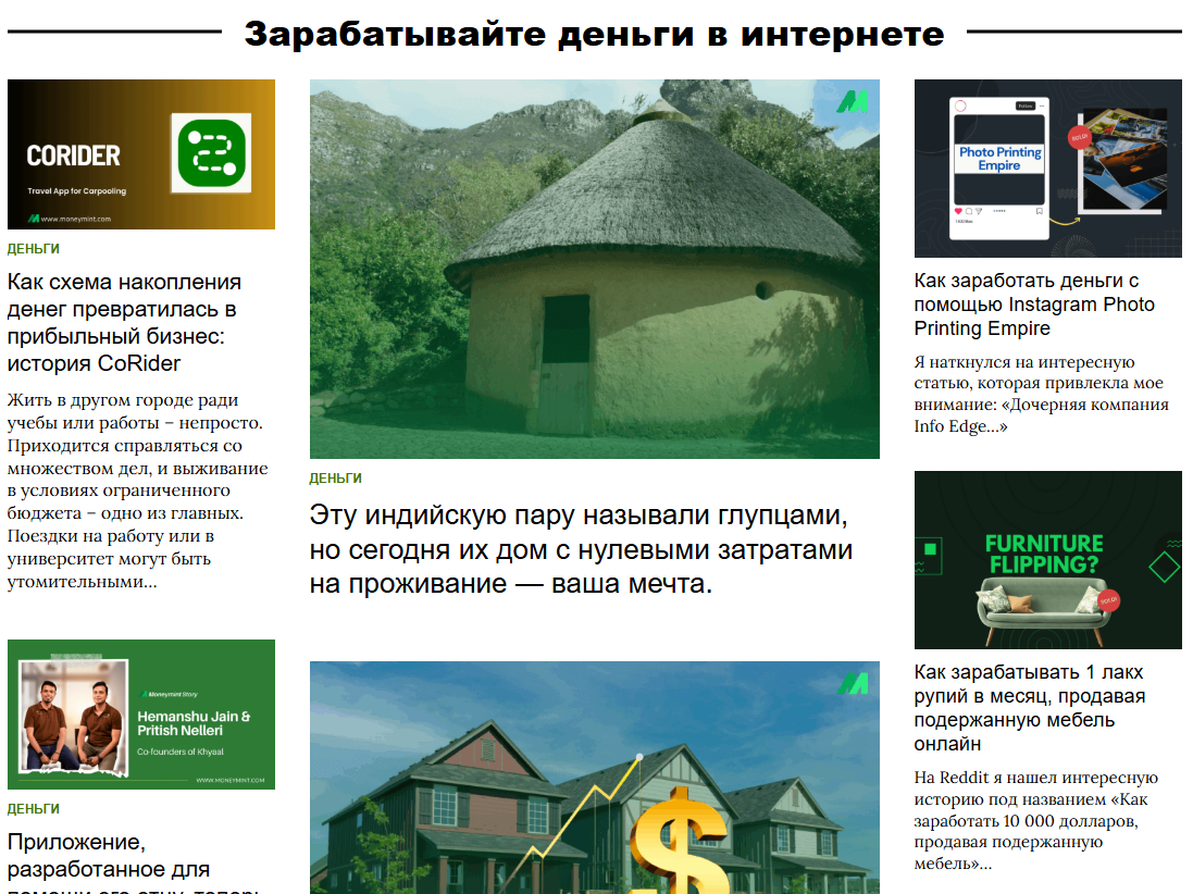 Ниже можно ознакомиться с материалами под общим заголовком “Зарабатывайте деньги в интернете”. При этом видно, что некоторые из статей с доходом в интернете никак не связаны. А те, что действительно могут предложить что-то интересное, вряд ли могут использоваться на практике ввиду расчета MoneyMintMedia на иностранцев.