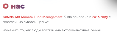 Представители платформы Mirante Fund Management Com утверждают, что компания начала предлагать услуги на рынке в 2016 году.
