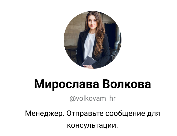Мирослава Волкова – hr менеджер, действующий от лица неизвестной компании. В описании профиля Мирославы нет никаких деталей, на связь с рекрутингом намекает адрес ее аккаунта – @ volkovam hr. Далее в статье расскажем почему опасно отвечать на сообщения от Мирославы.