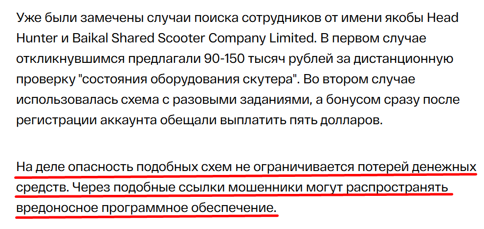Аферисты обычно имитируют деловой стиль общения, обещают высокие зарплаты, могут перевести клиента в фейковый чат с “руководством”.