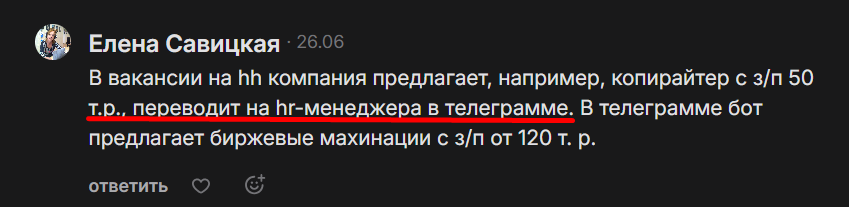 Мирослава Волкова может делать массовую рассылку с привлекательными вакансиями – согласно отзывам про работу в Телеграмм о ее коллегах, жулики постоянно придумывают новые трюки. Стоит остерегаться следующих офферов: оплата сертификатов, внесение комиссии за оформление трудового договора, перевод аванса за обучение.