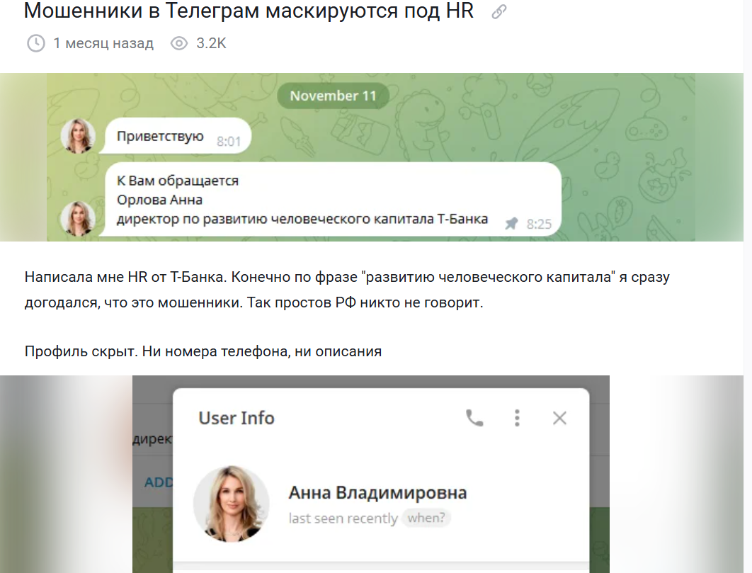 HR Мирослава Волкова и другие фейковые консультанты в Телеграме имитируют работу рекрутеров. Они могут находить жертв для своего финансового обмана на сайтах с вакансиями. Мирослава и ее коллеги нередко сообщают, что являются представителями каких-либо организаций. После того, как подставной менеджер заморочит голову соискателю рассказами о выгодной и “горящей” вакансии, от пользователя потребуют денежный перевод. Чтобы соискатель быстрее решился расстаться с нужной суммой, его заверяют, что на данную должность претендует масса других клиентов.Еще один вариант финансового развода от липового менеджера – предоставление фишинговой ссылки. Перед собеседованием якобы нужно заполнить анкету. После того как пользователь переходит на сомнительный ресурс, его конфиденциальные данные могут оказаться под угрозой. Известны случаи с получением доступа к блогам для публикации мошеннической рекламы.
