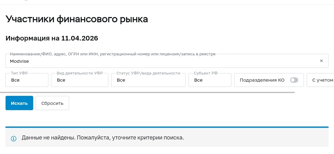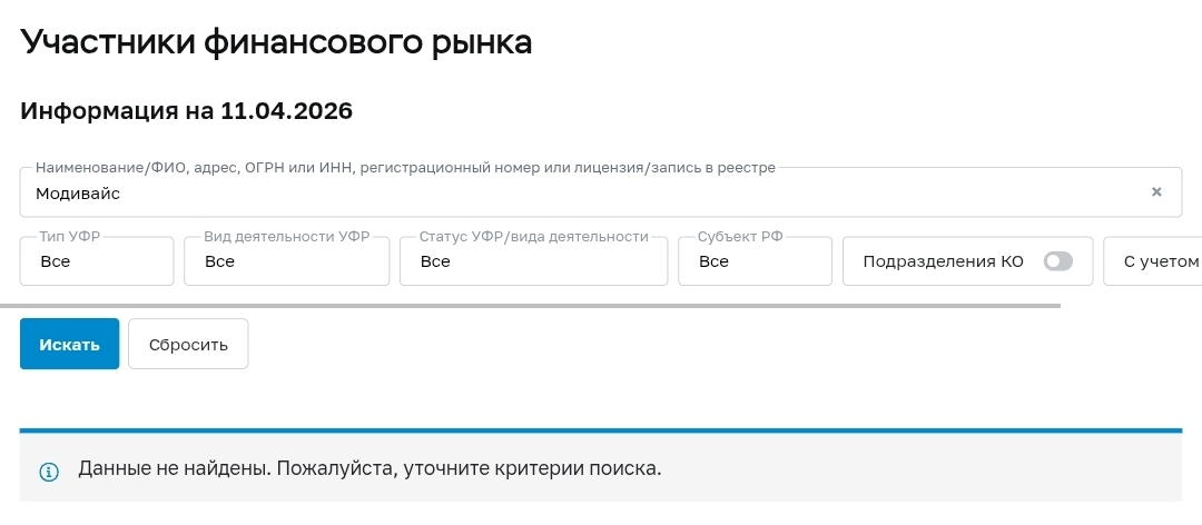 Инвестиционные платформы, работающие на российском рынке, обязаны быть включены в реестр операторов Банка России. Модивайс в этих реестрах не числился — ни под русским написанием, ни под латинским. Для нелегальных схем это норма: без лицензии нет регуляторного контроля, а значит, клиент при любом конфликте оказывался один на один с анонимными операторами без возможности защитить свои интересы официальным путем.
