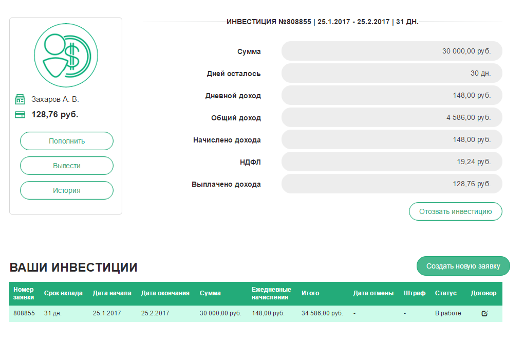 Раньше клиентам предлагали вносить депозиты под обещания высокой доходности, которые якобы шли на выдачу займов людям в России и поиск новых заемщиков. Минимальная сумма составляла 1000 рублей, максимальная 2 миллиона. Срок инвестиций — от 31 до 365 дней. Проценты якобы начисляются каждый день, а заявку на вывод можно было подать в любой момент, деньги обещали перевести в течение 24 часов. Также работала партнёрская программа: 10% от стоимости займа за привлеченного заемщика и 5% от суммы инвестиции за привлеченного инвестора.