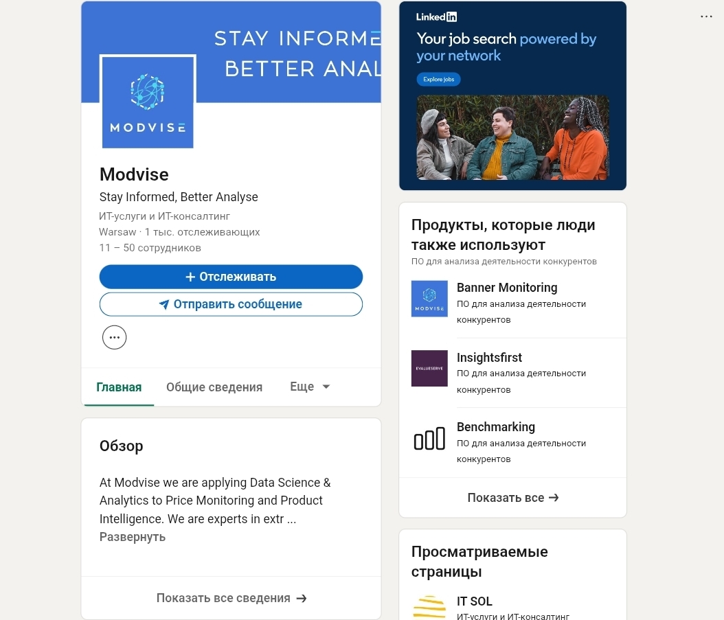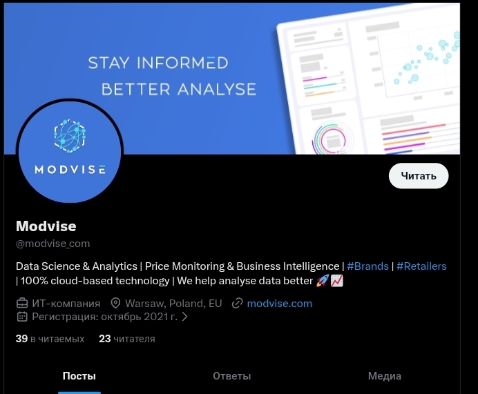 Twitter-аккаунт Modvise com и LinkedIn-страница Modvise принадлежат польской IT-компании — никакого контента об инвестициях там нет, только ритейл-аналитика и мониторинг цен. Недобросовестный проект собственных верифицируемых социальных сетей не имел — вероятно создавал временные фейковые аккаунты, которые исчезли вместе с самим проектом.