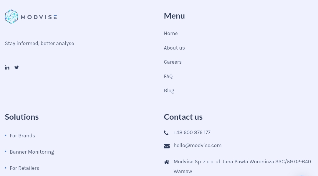 Modvise — это польская компания Modvise Sp, зарегистрированная в Варшаве. Нынешний Modvisecom — DataTech-компания, специализирующаяся на мониторинге цен, анализе данных и бизнес-аналитике для ритейлеров и брендов. Ее клиенты — европейские торговые сети, инструмент — парсинг и обработка данных с сайтов. Никаких инвестиционных вкладов, торговли криптовалютой или управления капиталом компания не предлагает.