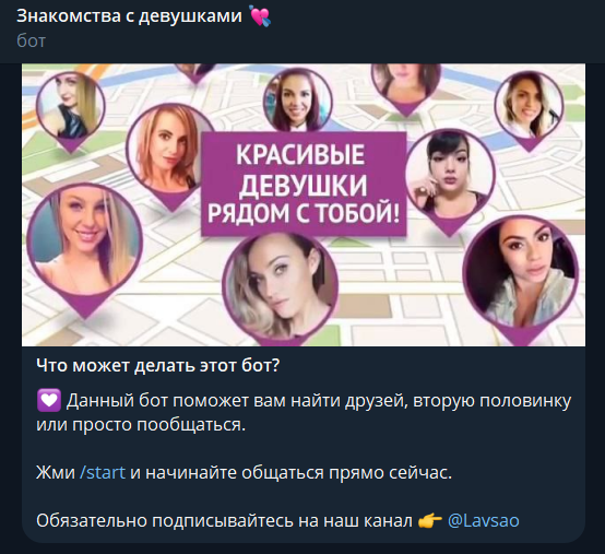 Бот представляет собой стандартный сомнительный проект для знакомств. После регистрации пользователя начинают засыпать анкетами противоположного пола, зазывая начать общение. На реальных сайтах знакомств подобное не происходит.