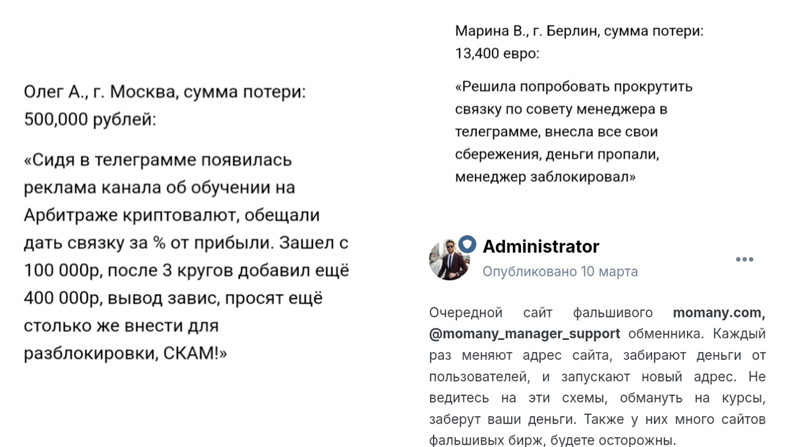 О сервисе momany com отзывы в сети исключительно негативные. Пользователи рассказывают, что схема мошенников завязана на арбитраже криптовалют. Скамеры предлагают заработать на перепродаже крипты и даже обещают дать рабочие связки. Некоторые пользуются доверием подписчиков и продают доступ в платные каналы, где и выкладывают якобы прибыльные связки. Таким образом они обманывают клиентов дважды.
