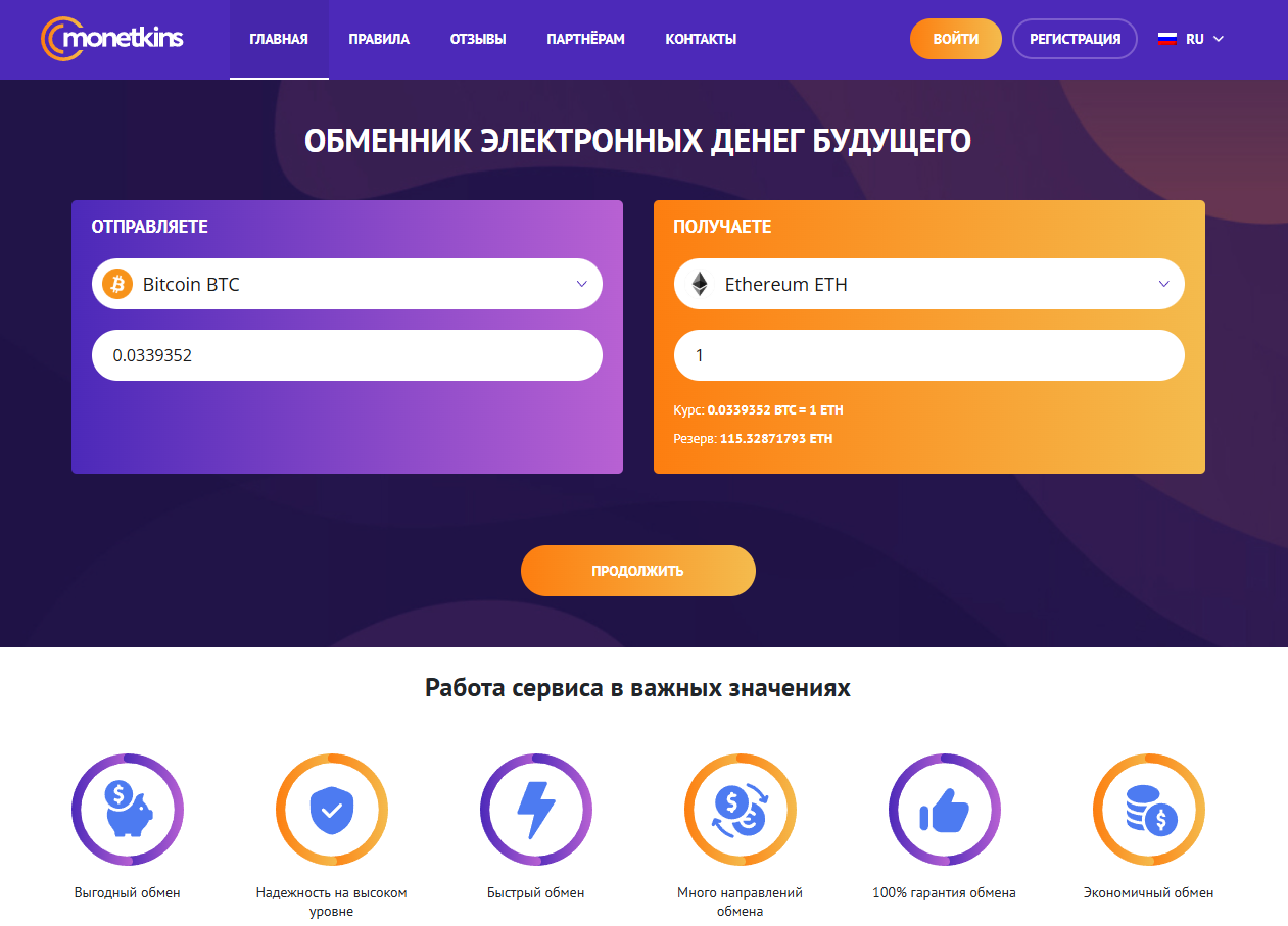 Криптообменник «Монеткинс» на рынке уже больше трех лет. Сервис обещает клиентам оперативно исполнять заявки. Механизм обмена на площадке прост, для проведения операции клиенту потребуется совершить буквально несколько простых действий.